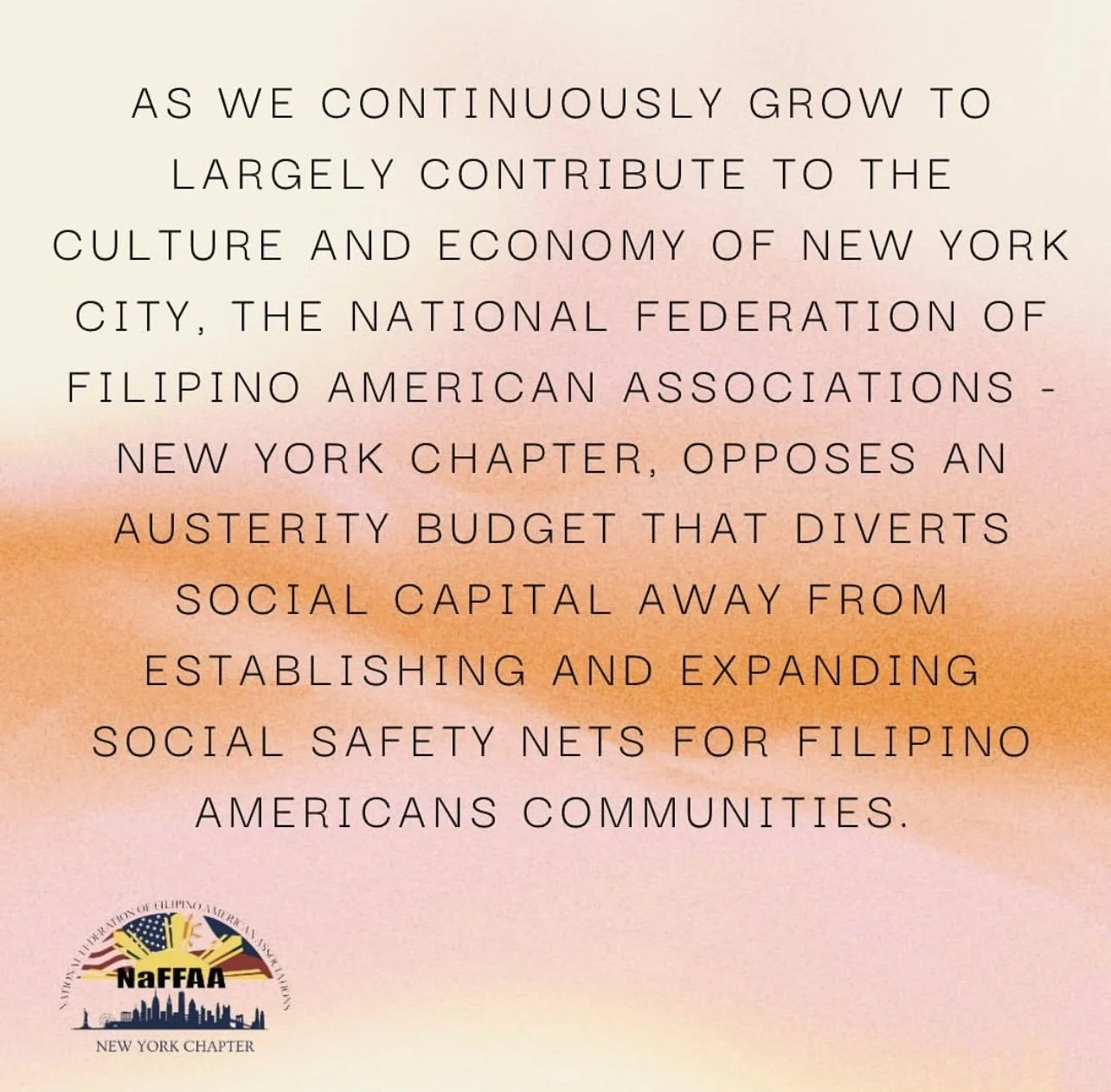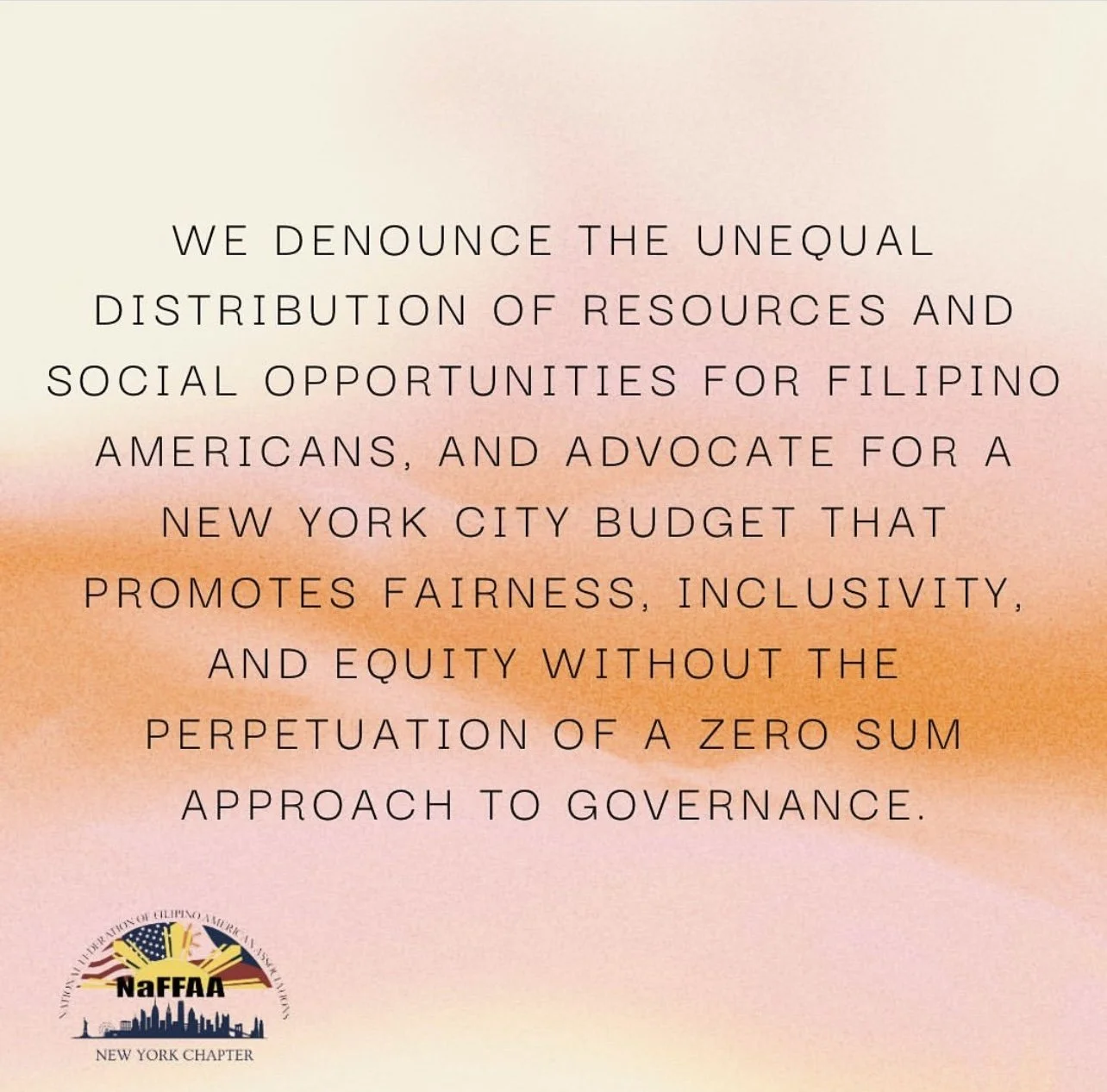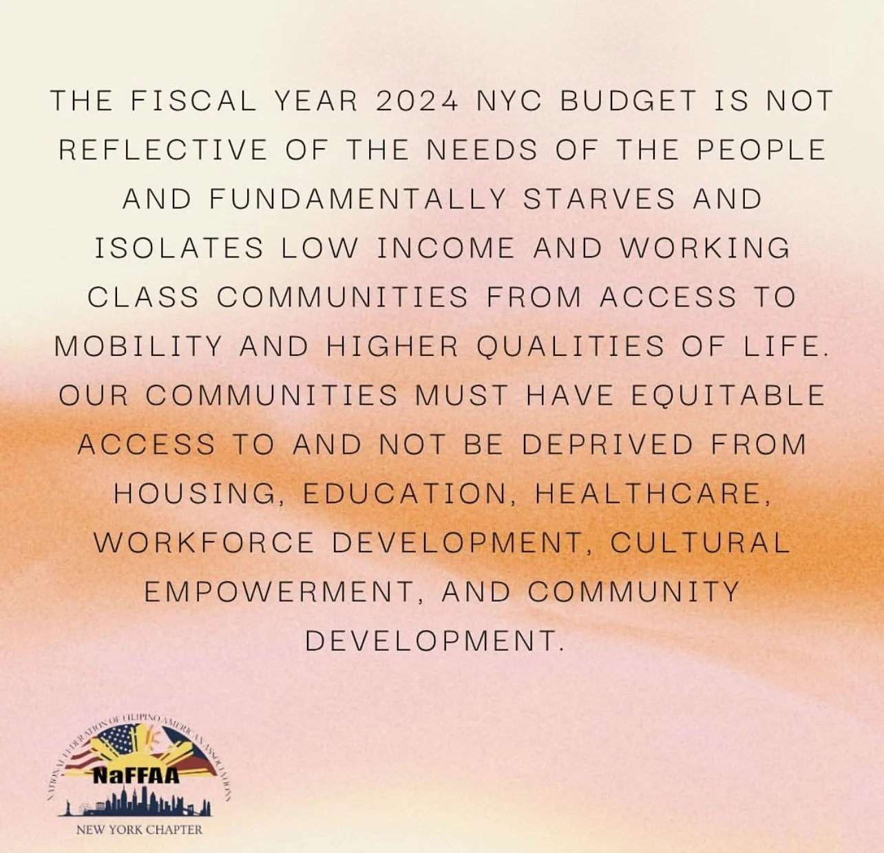 “NaFFAA-NY opposes the $107 Billion New York City FY24 Budget written with inhumane negligence that disenfranchises Filipino Americans from mobility, social capital, and equity.”